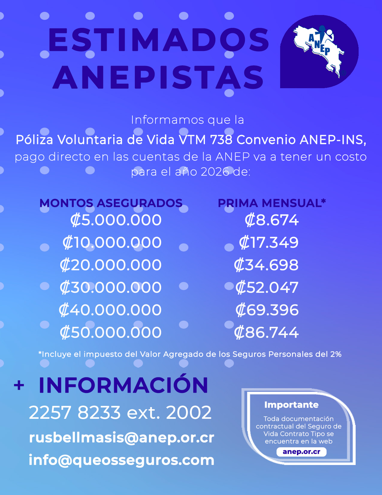 Es un placer poner a su disposición el presente documento informativo actualizado y generado de manera conjunta ANEP y los Agentes de Seguros del INS a cargo de la Póliza Voluntaria de Vida; con el claro objetivo de llevar a las familias anepistas una mayor protección económica ante la fatalidad. Rogamos dar lectura minuciosa al presente documento para una mejor comprensión y entendimiento de la operativa de la póliza. Ante dudas favor contactar a los teléfonos y correos que se indican, con las consultas puntuales.